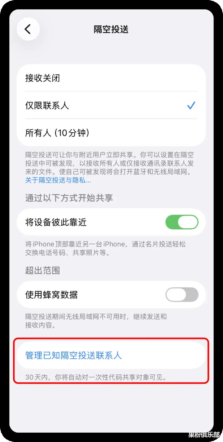 进入「隔空投送」设置中,可通过底部「管理已知隔空投送联系人」进入新选项。