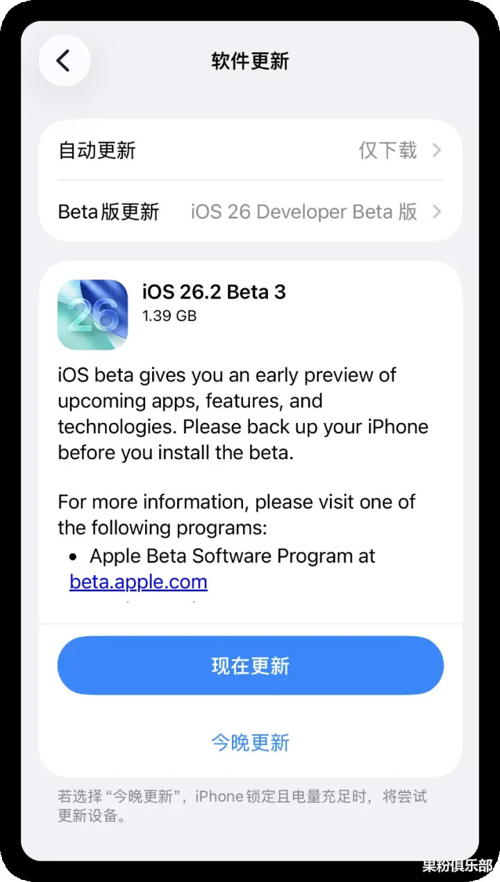 此前已更新 iOS 26 的用户,现在就可以去升级最新的测试版系统了。
