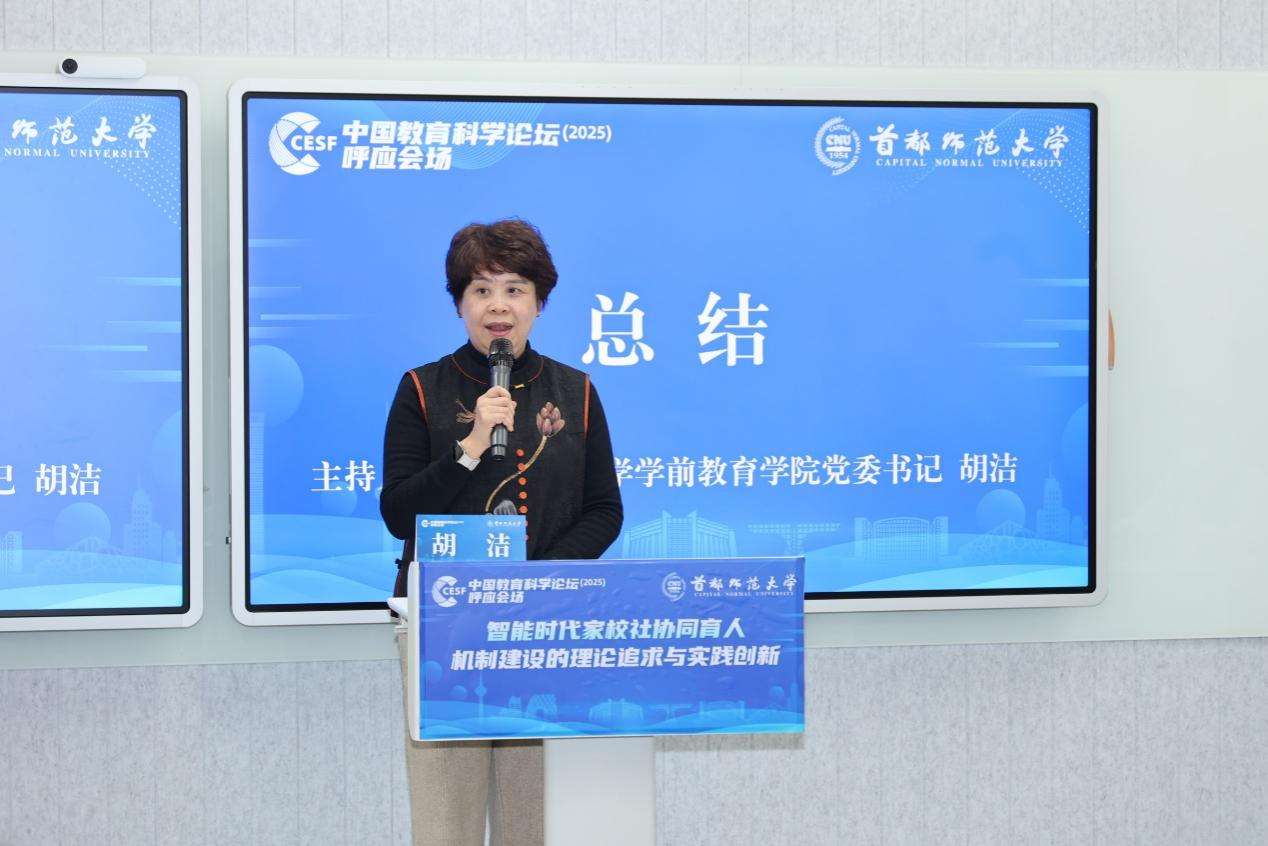 活动最后,首都师范大学学前教育学院党委书记胡洁作总结发言。她指出,此次研讨会凝聚多方智慧,围绕“智能时代的家校社协同育人”,活动达成四点共识。第一,协同育人是教育强国建设的重要驱动力;第二,各主体功能回归、发挥优势是协同育人机制健全的基础保障;第三,数字化与智能化是协同育人机制深水区改革的重要引擎;第四,理论引领、实践创新与技术赋能是协同育人机制跃迁的关键路径。