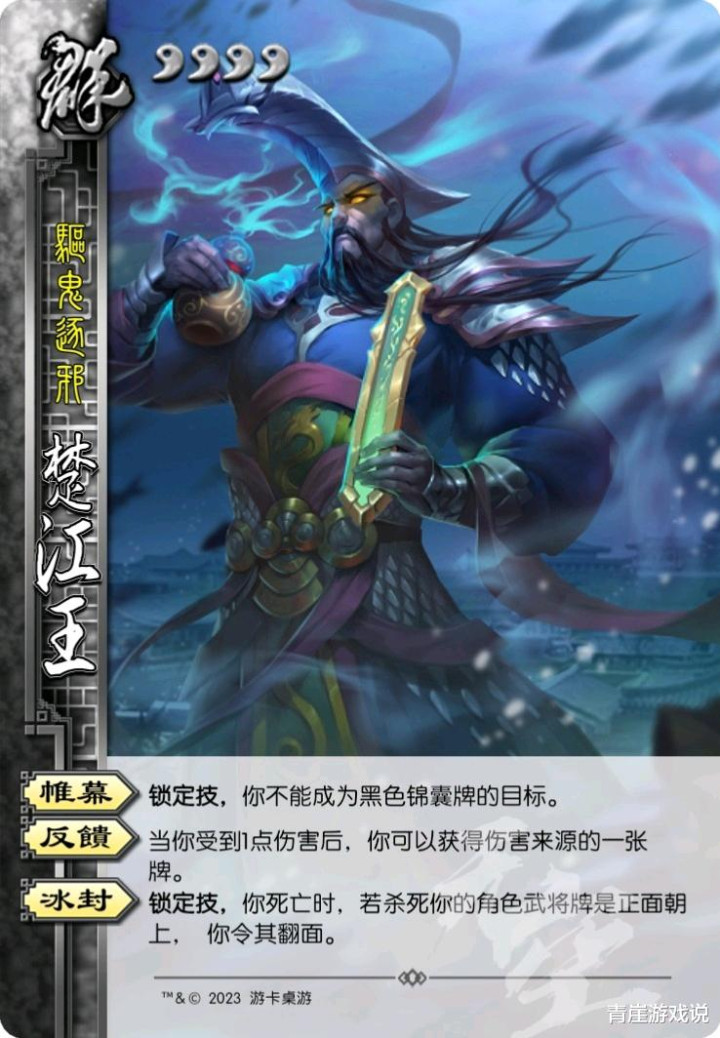 第二位阎王是楚江王,【帷幕】和贾诩同款,免疫黑色锦囊。【反馈】是司马懿同款,受伤可以偷牌。【冰封】是控制技能,将击杀的玩家翻面。楚江王和秦广王类似,只有防御和控制技能,随随便便就能击杀他。