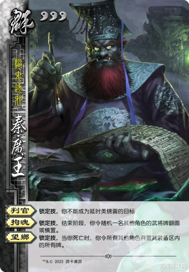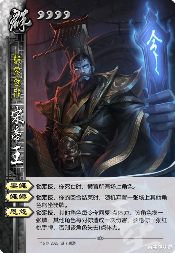 第三位阎王是宋帝王,【黑绳】可以横置所有角色。【绳缚】有拆迁能力,弃置玩家的坐骑。【恩怨】和法正同款,是防御技能。宋帝王完全没有主动能力,全是控制和防御技能,玩家根本不需要害怕他。