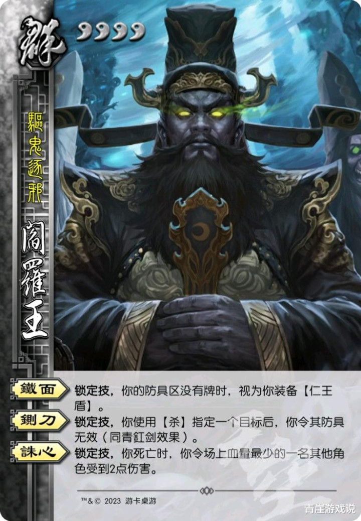 第五位阎王是阎罗王,【铁面】是自带仁王盾防具,【铡刀】等于自带了青釭剑效果。【诛心】是死亡时,对血量最少的玩家造成两点伤害。阎罗王虽然只有死亡时会造成暴击伤害,但如果脆皮武将接下两点伤害,又如何面对接下来更强的五大阎罗呢?