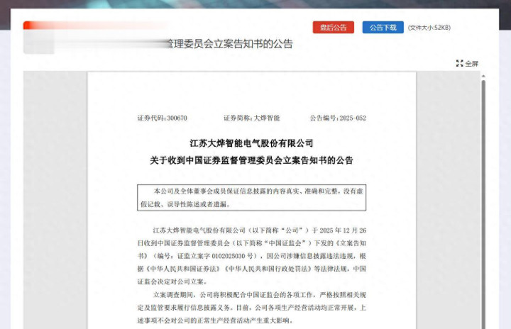 江苏大烨智能电气股份有限公司(股票简称:大烨智能,股票代码:300670)于2025年12月26日晚发布收到证监会《立案告知书》(编号:证监立案字0102025030号)的公告,因公司涉嫌信息披露违法违规,根据《中华人民共和国证券法》、《中华人民共和国行政处罚法》等法律法规,证监会决定对公司立案。