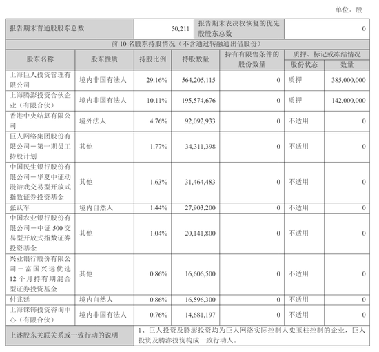 截至2025年6月30日,上海巨人投资管理有限公司持股29.16%,上海腾澎投资合伙企业(有限合伙)持股10.11%,香港中央结算有限公司持股为4.76%,巨人网络集团股份有限公司-第一期员工持股计划持股为1.77%;